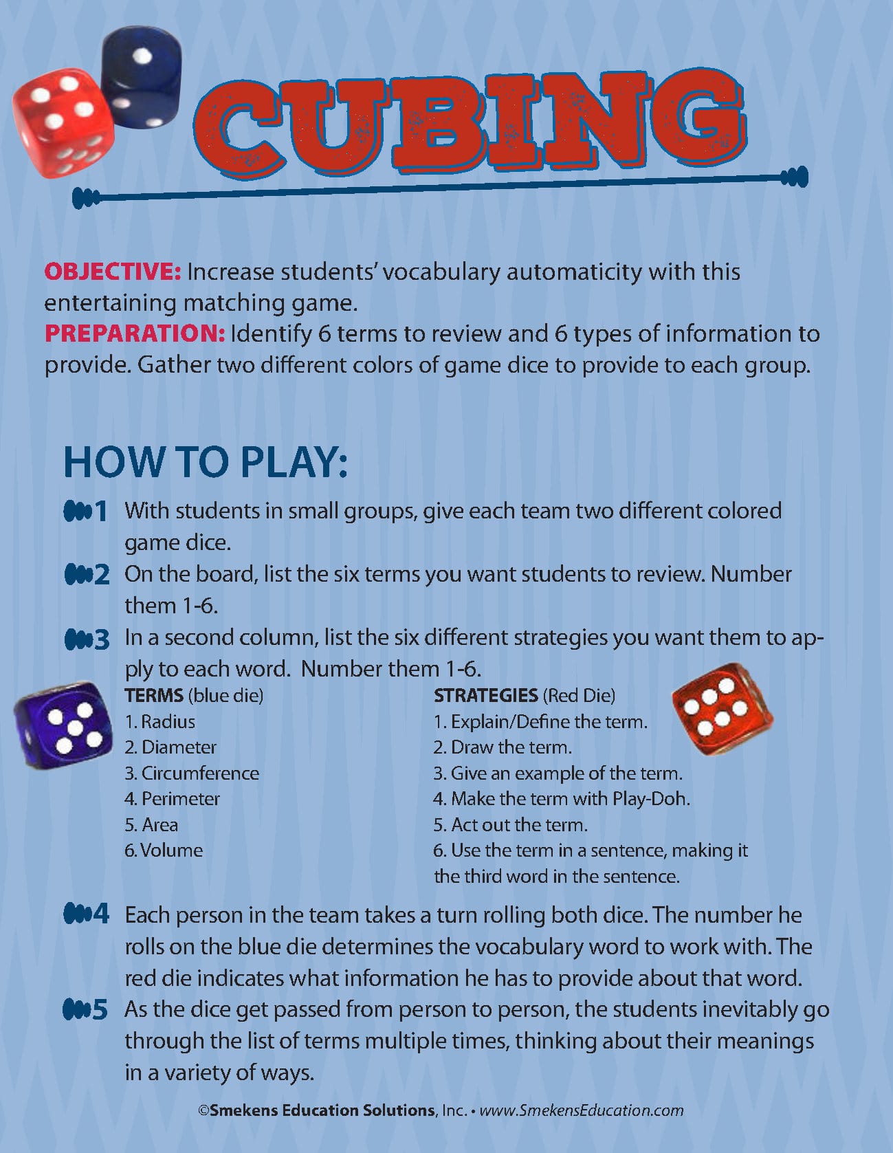 After the teacher introduces and explains the term to students in a variety of ways, the students will then restate the meaning in their own words.